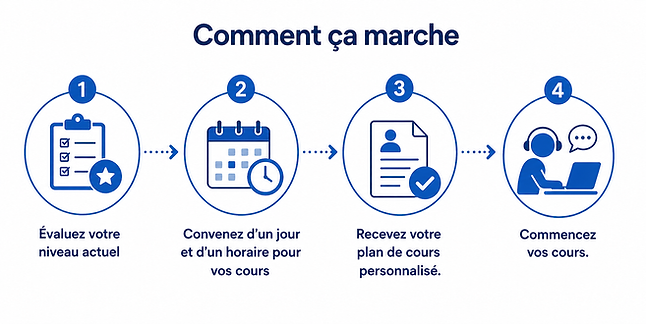Bilan de niveau gratuit en grammaire, expression écrite, expression orale et compréhension, avant le démarrage des cours.